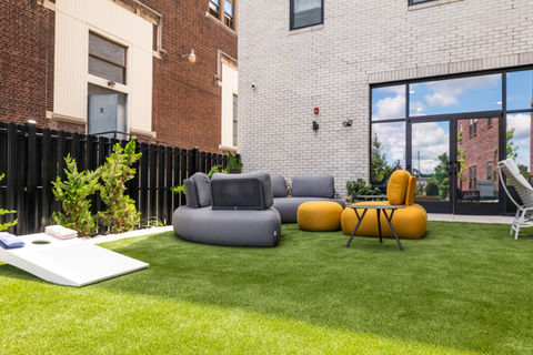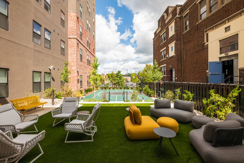 Exclusive student living in South Bethlehem just steps from Lehigh University. This upscale new development incorporated two outdoor courtyards for student/resident engagement and outdoor recreation. One courtyard was focused on outdoor interaction with a hardscape plaza, flexible seating, fire pit, cooking counter and dog park. The other courtyard extends from the indoor gym and wellness center and offers an outdoor recreation court for pickleball, half-court basketball and other court games while also offering an outdoor turf area for yoga, fitness, and various flexible uses.